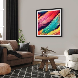 Poster în ramă neagră - Pene colorate în nuanțe vibrante pe un fundal întunecat - 50x70cm - Curcubeu cu pene - Decorațiune modernă pentru perete pentru living și dormitor ARTTOR