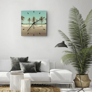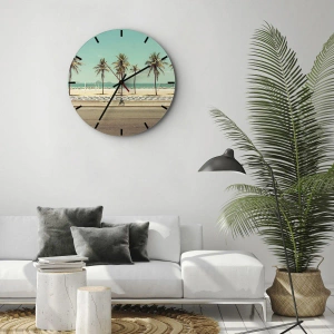 Ceas de perete „Pe plajă” - Palmieri și o plajă cu o promenadă lângă marea turcoaz
