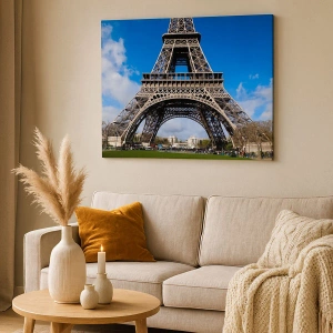 Tablou pe pânză Canvas - Turnul Eiffel pe fundalul unui cer albastru și al unui parc verde - 70x50cm - Întregul Paris la picioarele ei - Decorațiune modernă pentru perete pentru living și dormitor ARTTOR