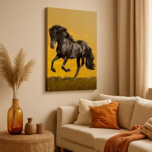 - O pictură pe pânză care înfățișează un cal negru galopând pe fundalul unui apus de soare auriu.