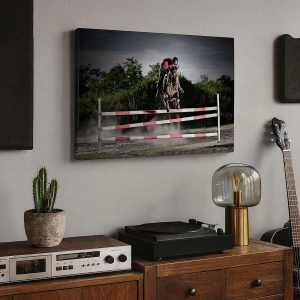 Tablou pe pânză Canvas - Un călăreț pe un cal sărind peste un obstacol pe o pistă de curse - 70x50cm - Împreună pentru victorie - Decorațiune modernă pentru perete pentru living și dormitor ARTTOR