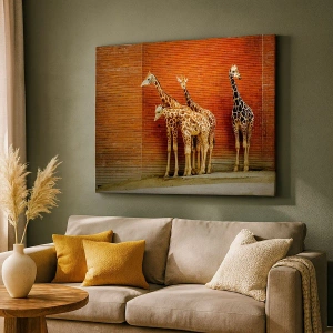 - Acest tablou înfățișează patru girafe așezate pe un perete de cărămidă, într-un decor artistic. Perfect pentru interioare inspirate de stiluri exotice și moderne.