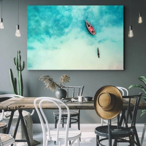 - O imprimare pe pânză care înfățișează bărci pe ape turcoaz văzute din perspectivă, perfectă pentru interioare inspirate de natură și liniște.