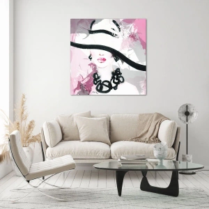 Tablou pe sticlă - Portretul unei femei cu o pălărie neagră pe fundal roz - 70x50cm - Studiu unei dame în negru și roz - Decorațiune modernă pentru perete pentru living și dormitor ARTTOR