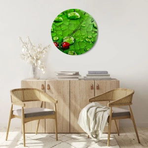 Ceas de perete - Întâlnire în verde - Buburuze pe o frunză cu picături de apă