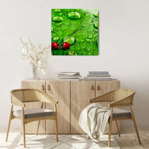 - O fotografie macro cu buburuze pe o frunză acoperită de picături de apă. Un motiv natural care aduce prospețime și armonie oricărui interior.