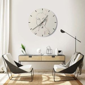 - Un ceas de perete modern, cu un portret minimalist al unei fețe de femeie, executat într-o tehnică cu o singură linie. Fundalul bej adaugă subtilitate și armonie compoziției.