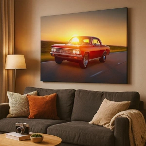 Tablou pe pânză Canvas - O mașină roșie la apusul soarelui pe un drum deschis - 70x50cm - Tentația este roșie - Decorațiune modernă pentru perete pentru living și dormitor ARTTOR