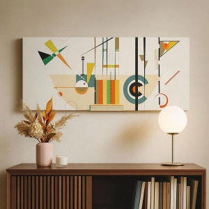 Compoziția este formată din diverse elemente geometrice, cum ar fi cercuri, linii și triunghiuri, care au fost combinate într-un întreg coerent. Culori precum galben, verde, portocaliu și albastru conferă picturii un caracter vesel și pozitiv, subliniind în același timp designul său unic. Aceasta este o pictură care aduce energie și creativitate în interior.