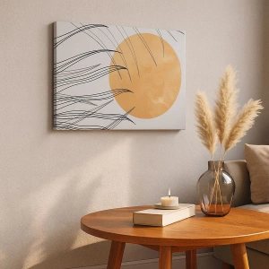 - Această grafică abstractă înfățișează fire de iarbă pe fundalul unui soare mare, portocaliu. Estetica sa simplă și modernă o face perfectă pentru un living sau un dormitor.