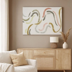 - pictură cu arcuri abstracte în nuanțe pastelate de verde, roz, galben și bej. Această compoziție delicată și aerisită este perfectă pentru interioarele scandinave sau în stil boho, introducând un accent artistic subtil.