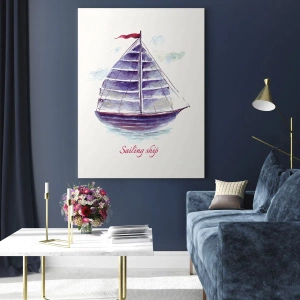 - pictură subtilă în acuarelă care înfățișează o corabie cu pânze cu catarg roșu și inscripția „Navă cu pânze”. Nuanțele delicate de albastru și violet transmit atmosfera liniștită a unei călătorii pe mare. Perfectă pentru interioare cu tematică nautică.