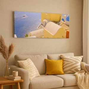 Tablou pe pânză Canvas - Arhitectură grecească cu vedere la mare și o barcă în fundal - 70x50cm - Peisaj grecesc în alb și albastru - Decorațiune modernă pentru perete pentru living și dormitor ARTTOR