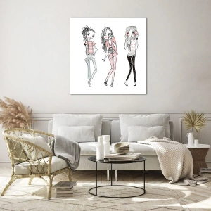 Tablou pe sticlă - Trei fete elegante în culori pastelate - 70x50cm - Hai la distracție - Decorațiune modernă pentru perete pentru living și dormitor ARTTOR