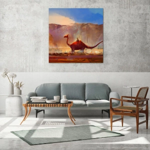 Tablou pe sticlă care înfățișează un peisaj fantastic cu un călăreț pe o creatură preistorică. Perfect pentru interioare cu un fler artistic care valorizează creativitatea și decorațiunile originale.