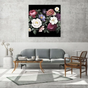 Tablou pe sticlă - Compoziție florală cu bujori pe fundal negru - 70x50cm - Dintr-o grădină engleză - Decorațiune modernă pentru perete pentru living și dormitor ARTTOR