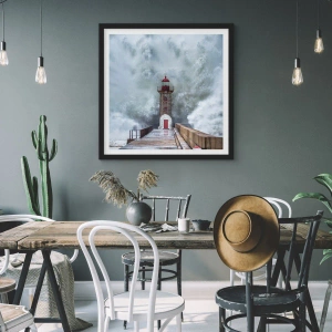 Poster în ramă neagră - Un far înconjurat de valuri puternice în timpul unei furtuni - 50x70cm - Zgomotul apelor, sunetul vântului - Decorațiune modernă pentru perete pentru living și dormitor ARTTOR