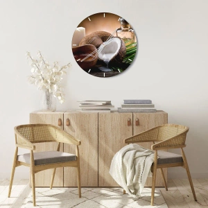 - nucă de cocos despicată cu lapte și accesorii tropicale pe un fundal de lemn. Un ceas rotund din sticlă de 30x30 cm cu un motiv exotic și natural.