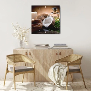 Ceas de perete - Ceas pe sticlă - Nucă de cocos despicată cu lapte și accesorii tropicale - 30x30cm - Sănătate din insulele tropicale - Decorațiune modernă pentru perete pentru living, bucătărie și dormitor ARTTOR