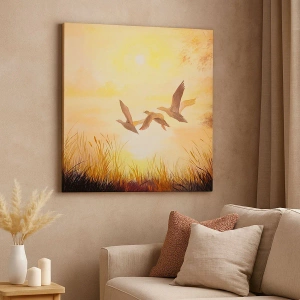 - Această imprimare pe pânză de 70x50 cm înfățișează rațe zburând la răsăritul soarelui peste un lac liniștit. O compoziție subtilă și armonioasă care aduce pace și eleganță oricărui interior.