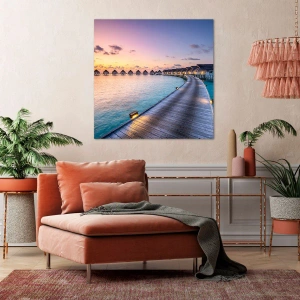 Imprimeu artistic pe pânză „Sărbători - Întoarcerea la surse” este un element decorativ unic care te transportă într-o atmosferă tropicală plină de pace și lux. Reprezintă un dig pitoresc care duce la casele de pe apă, scăldat în lumina caldă a soarelui care apune.