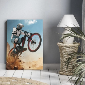 Tablou pe pânză „Cycling Demon Madness” este o compoziție dinamică ce surprinde un moment de acțiune și motivație. Înfățișează un ciclist pe o bicicletă de munte făcând o săritură spectaculoasă, cu un fundal plin de stânci pitorești și un cer albastru, creând o imagine plină de energie și mișcare.