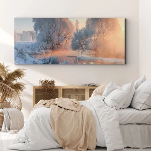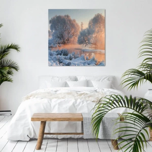 - Un peisaj magic de iarnă, cu copaci acoperiți de zăpadă, scăldați în razele soarelui apus. Râul reflectă delicat lumina, creând un sentiment de pace și armonie. Un plus perfect pentru interioarele elegante.