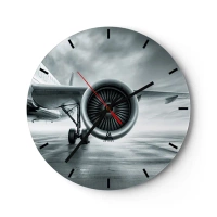 Ceas de perete - Ceas pe sticlă - Vedere a motorului unui avion de pasageri pe pista aeroportului - 30x30cm - Ce putere! - Decorațiune modernă pentru perete pentru living, bucătărie și dormitor ARTTOR