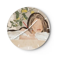 Ceas de perete - Ceas pe sticlă - O femeie cu părul lung în fața unui lămâi - 30x30cm - Frumusețea sudului - Decorațiune modernă pentru perete pentru living, bucătărie și dormitor ARTTOR