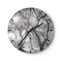 Ceas de perete - Ceas pe sticlă - Copaci alb-negri în lumina soarelui în pădure - 30x30cm - Într-o livadă de măslini - Decorațiune modernă pentru perete pentru living, bucătărie și dormitor ARTTOR