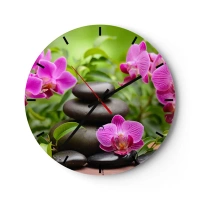 Ceas de perete - Ceas pe sticlă - Orhidee violetă pe un fundal de pietre și bambus - 30x30cm - Într-un echilibru pașnic - Decorațiune modernă pentru perete pentru living, bucătărie și dormitor ARTTOR