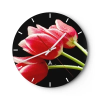 Ceas de perete - Ceas pe sticlă - Lalele roșii cu picături de apă pe fundal negru - 30x30cm - Promisiunea unei iubiri pure - Decorațiune modernă pentru perete pentru living, bucătărie și dormitor ARTTOR