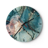 Ceas de perete - Ceas pe sticlă - Stropi artistice de culoare în nuanțe de turcoaz și roz cu accente aurii - 30x30cm - Mătase albastră, tul roz - Decorațiune modernă pentru perete pentru living, bucătărie și dormitor ARTTOR