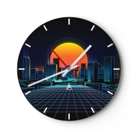 Ceas de perete - Ceas pe sticlă - peisaj urban retro-futurist cu lumini neon și apus de soare - 30x30cm - Încă mai vrei să ajungi la lumea reală? - Decorațiune modernă pentru perete pentru living, bucătărie și dormitor ARTTOR