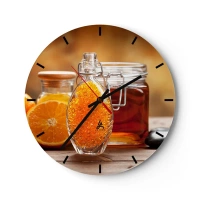 Ceas de perete - Ceas pe sticlă - O sticlă de miere cu portocale în fundal pe o masă de lemn - 30x30cm - Gust și aromă de soare - Decorațiune modernă pentru perete pentru living, bucătărie și dormitor ARTTOR
