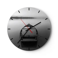 Ceas de perete - Ceas pe sticlă - O barcă singuratică pe un lac liniștit, în alb și negru. - 30x30cm - Dor și melancolie - Decorațiune modernă pentru perete pentru living, bucătărie și dormitor ARTTOR