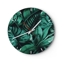 Ceas de perete - Ceas pe sticlă - Frunze verzi tropicale pe un fundal întunecat - 30x30cm - Profunzimea verdelui tropical - Decorațiune modernă pentru perete pentru living, bucătărie și dormitor ARTTOR