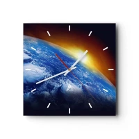 Ceas de perete - Ceas pe sticlă - Răsărit de soare deasupra planetei albastre - 30x30 cm