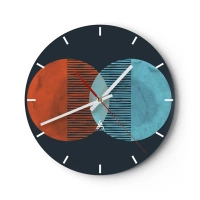 Ceas de perete - Ceas pe sticlă - Cercuri abstracte în nuanțe de roșu și albastru pe fundal negru - 30x30cm - Despre originea figurilor geometrice - Decorațiune modernă pentru perete pentru living, bucătărie și dormitor ARTTOR