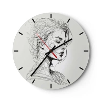 Ceas de perete - Ceas pe sticlă - Schiță alb-negru a feței unei femei gânditoare - 30x30cm - Desenată cu linii - Decorațiune modernă pentru perete pentru living, bucătărie și dormitor ARTTOR