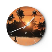 Ceas de perete - Ceas pe sticlă - Palmieri la apus peste ape calme cu silueta unui pescar - 30x30cm - Timp de relaxare - Decorațiune modernă pentru perete pentru living, bucătărie și dormitor ARTTOR
