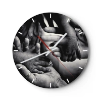 Ceas de perete - Ceas pe sticlă - Mâinile se ating într-un gest de unitate - 30x30cm - A fi om - Decorațiune modernă pentru perete pentru living, bucătărie și dormitor ARTTOR