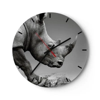 Ceas de perete - Ceas pe sticlă - Un rinocer în stil alb-negru pe un fundal neutru - 30x30cm - O forță de neoprit - Decorațiune modernă pentru perete pentru living, bucătărie și dormitor ARTTOR