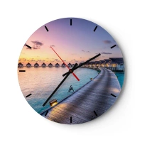 Ceas de perete - Ceas pe sticlă - O potecă de-a lungul plajei cu bungalouri pe fundalul apusului de soare - 30x30cm - Vacanță - înapoi la sursă - Decorațiune modernă pentru perete pentru living, bucătărie și dormitor ARTTOR