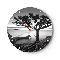 Ceas de perete - Ceas pe sticlă - Un copac pe o stâncă cu vedere la mare, în alb și negru - 30x30cm - Liniște până la orizont - Decorațiune modernă pentru perete pentru living, bucătărie și dormitor ARTTOR