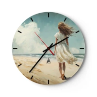 Ceas de perete - Ceas pe sticlă - O femeie într-o rochie albă mergând desculță pe plajă - 30x30cm - Vreau să întâlnesc soarele și vântul - Decorațiune modernă pentru perete pentru living, bucătărie și dormitor ARTTOR