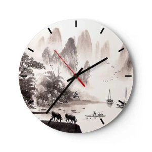 Ceas de perete - Ceas pe sticlă - Un peisaj pitoresc cu apă, munți și bărci în alb și negru. - 30x30cm - Viața exotică de zi cu zi a Estului - Decorațiune modernă pentru perete pentru living, bucătărie și dormitor ARTTOR