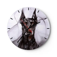 Ceas de perete - Ceas pe sticlă - Portretul unui Doberman într-un stil geometric modern - 30x30cm - Născut cu noblețe - Decorațiune modernă pentru perete pentru living, bucătărie și dormitor ARTTOR