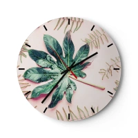 Ceas de perete - Ceas pe sticlă - O frunză verde mare pe un fundal roz deschis, cu detalii florale. - 30x30cm - Studiu de verdeață pe un fundal roz - Decorațiune modernă pentru perete pentru living, bucătărie și dormitor ARTTOR
