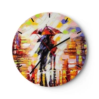 Ceas de perete - Ceas pe sticlă - Un cuplu sub o umbrelă roșie pe un fundal colorat, pictural - 30x30cm - Împreună prin noapte și ploaie - Decorațiune modernă pentru perete pentru living, bucătărie și dormitor ARTTOR